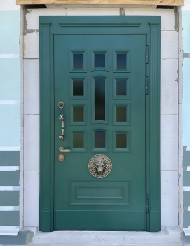 Парадная дверь с карнизом, стеклопакетами, отбойниками