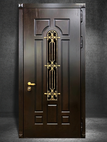 Термодверь МДФ шпон (окрас RAL) с кованой решеткой и стальным декором